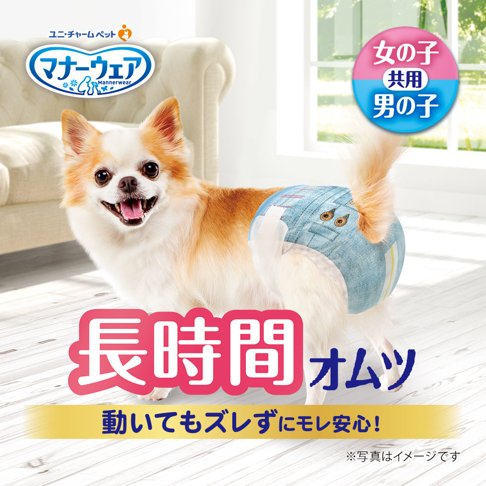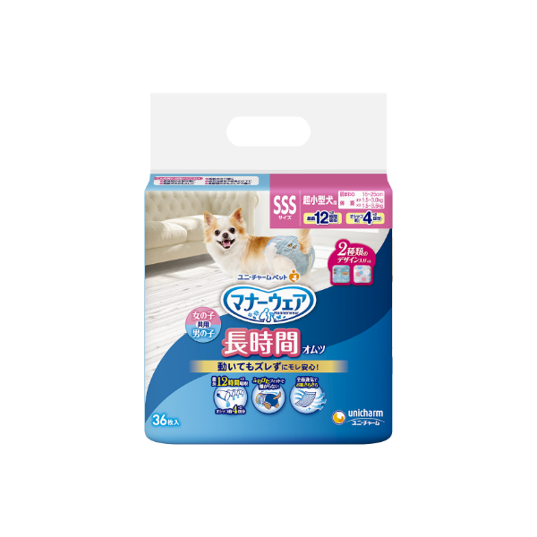 ・SSSサイズ(15~25cm) ●オスとメスでは性器の位置が異なるため、正しいサイズをお選び頂けるように、各サイズの適応体重を性別で分けています。 ●上記の表は目安です。愛犬・愛猫の成長度合い、体型によりサイズが異なる場合がございます。 ●ワンちゃんがやせ細ってきても、尿量はやせる前と変わらない場合がございますので、オムツを小さいサイズへ替えるのではなく、そのままのサイズでしっかりとしめてご使用されることをおすすめ致します。 ●オスのワンちゃんには「ユニ・チャームペット マナーウェア 男の子おしっこ用長時間オムツ」のサイズをお確かめの上、併用をおすすめ致します。 |