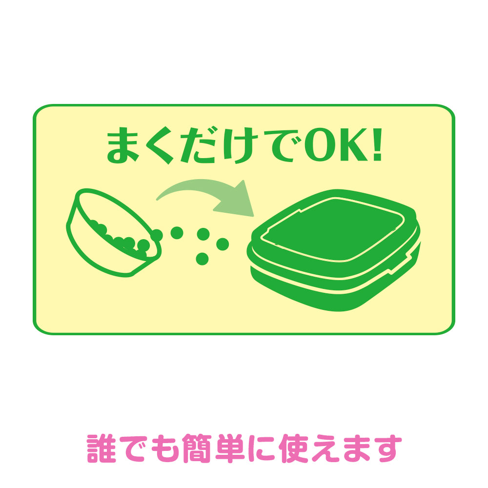 使い方は簡単。フタに消臭ビーズをとって、猫トイレの上からサッとまくだけ!誰でも簡単に使えます。