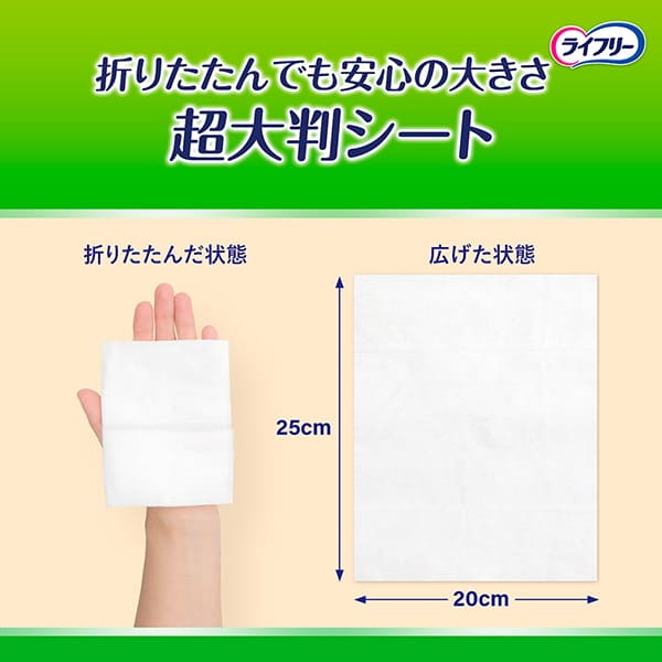 超大判スッキリ おしりふき1枚でしっかりキレイ 超大判だから1枚でしっかり拭きとれる!折りたたんでも安心の大きさ |