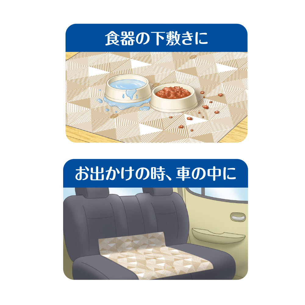 - ●愛犬のペットシート・トレーの下や愛猫のトイレの下に敷くシートとして ●愛犬・愛猫の食事時に、食器の下に敷くランチョンマットとして ●愛犬・愛猫と車でのお出かけの際に、車内に敷く汚れ防止シートとして