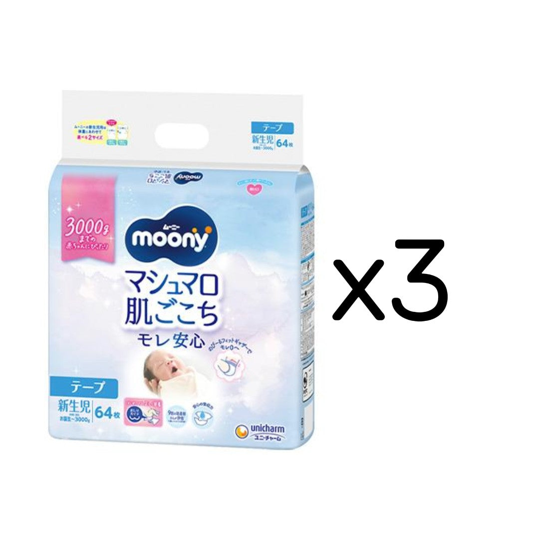 〔テープ 新生児サイズ〕ムーニーマシュマロ肌ごこちモレ安心新生児 お誕生~3000g 64枚 - ケース販売(3000g 64枚×3袋) -